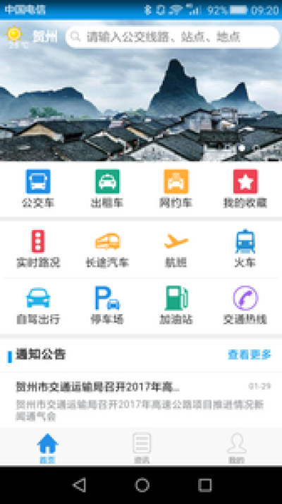 畅行贺州全方面涵盖公交、租车、出租车、实时路况、航班、火车、停车场等多项出行服务。
