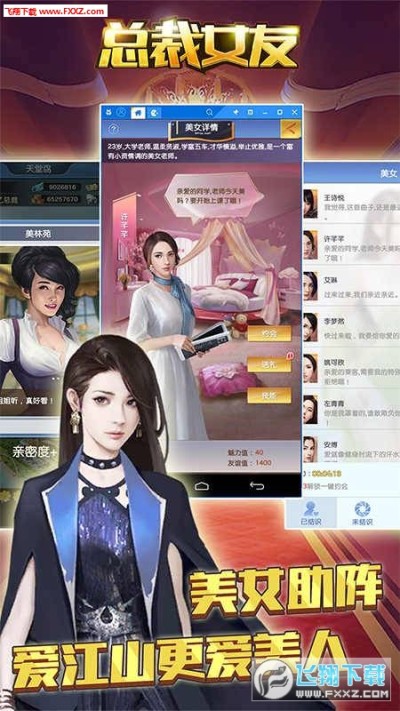 《总裁女友安卓版》是一款商战题材的模拟经营类手游,游戏中玩家将成为一名总裁,不断的经营发展自己的商业帝国,管理自己的资产并招纳有能力的人才,让众多女神成为自己的小秘,并不断提升好感度开启彼此的故事,喜欢的玩家快来登上巅峰吧!