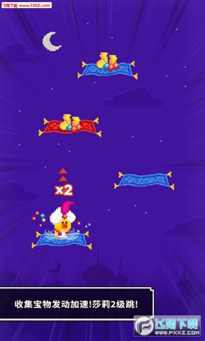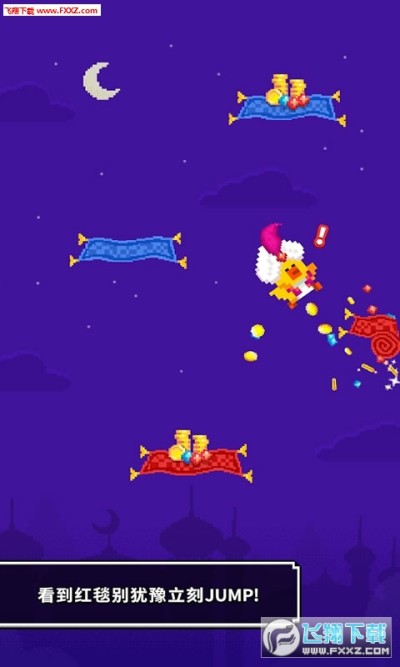 你需要控制莎莉鸡在魔毯上不断的跳跃,不同颜色的魔毯有着不同的效果,无尽的挑战模式,帮助莉莎鸡不断的突破高分,喜欢的话快来尝试看看吧。