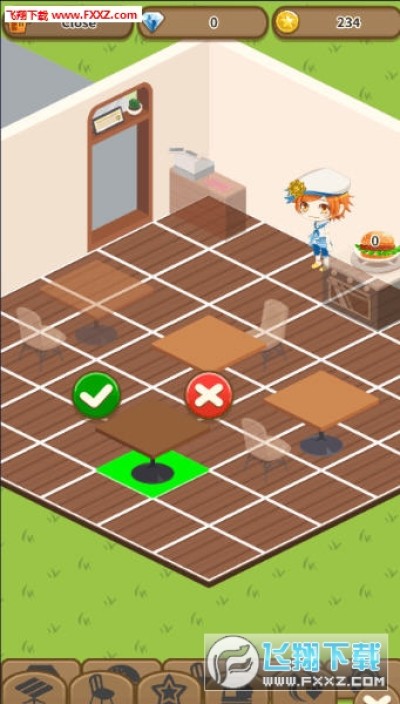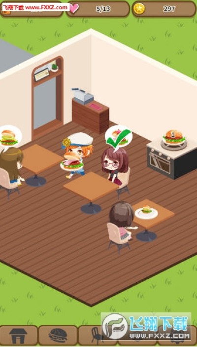 2,经营模拟部分:咖啡屋中另有5位帅气的小哥哥负责各项事宜,他们有着各自的剧情,对话甚至有声优配音。咖啡屋一开始只有两组桌椅,完成顾客的点单后能获得金币,可用来购买新的桌椅、吧台,或铺设更多的地板、瓷砖、墙壁等,以扩建你的咖啡屋,容纳更多的顾客光临。还有几种装饰吉祥物,布置在屋里后能获得各种有利消消乐或经营的效果。