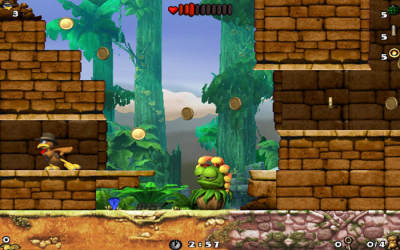 玩家要挑战30道关卡,游戏中具有暗藏的陷阱和丰富的敌人,暴怒的猩猩,善攻的鳄鱼,奇异的植物,血腥的蝙蝠等,你必须具备相当的勇气和能力,才能成为一名真正的宝物猎人。