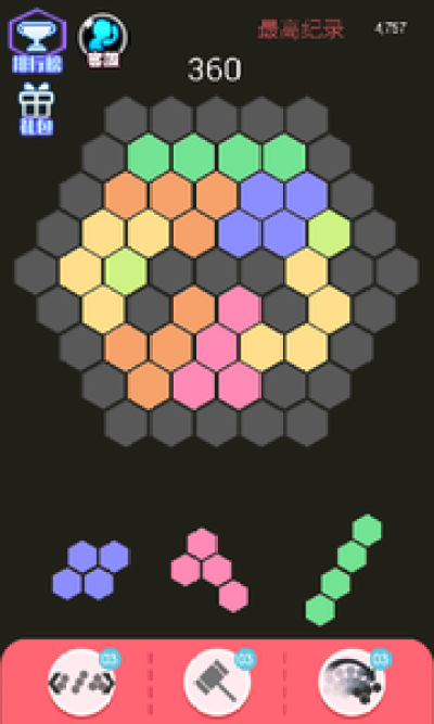 2.游戏中你需要注意将单独一个六边形留着,以供填补一些空需;