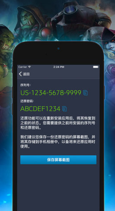 当您完成首次安装安全令以后,就会生成用于手机安全令绑定、以及将重新安装的应用恢复到之前状态的序列号和还原密码.我们建议您在相册中保存一份还原密码的屏幕截图,以备将来还原安全令时使用.(注意:请在原手机安全令尚能使用时,记录其序列号和还原密码)
