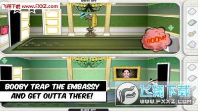 当然跟标题一样,游戏是存在对战性质的,所以对方的间谍也会同时进行搜索,玩家需要比对方先收集到全部道具并且逃离大使馆。在游戏中玩家可以利用身上的手枪,炸弹等道具制作陷阱,在对方打开箱子或者大门的时候就会触发机关挂掉,挂掉后会有一定的复活时间,这样在对方中招后玩家会获得更充裕的时间去收集道具。