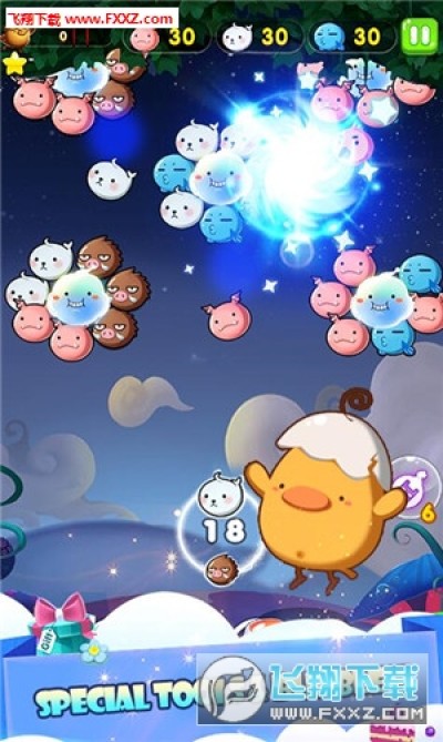 - 抛出泡泡,3个相同花色连在一起就可消除和得分喔!