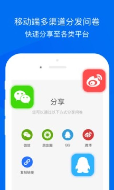 2.一键分发,支持多渠道发布问卷:可一键分享到微信、QQ、微博等各类平台,帮组你迅速扩散,收集数据。