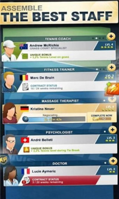 在你的网球生涯,你需要仔细聘请员工,并在其战术使用基于每个网球比赛的决定。坚持练习,让你的职业生涯首个王牌!
