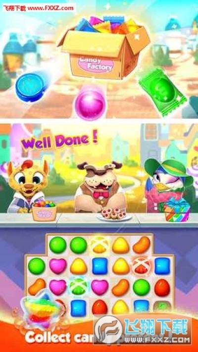 将3个或更多的糖果互换在一起,收集这些美味的糖果。帮助熊猫先生完成订单并交付给不同的动物在糖果森林!记得一定要实现目标在有限的步数内!