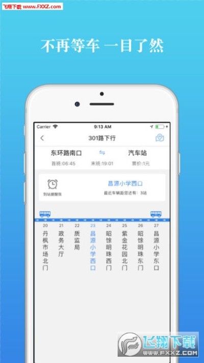 4.输入想要查询的路线,开启GPS定位,可查询距您所在站点还有几站距离及到站提醒您下车(绿色公交车模型会随车辆行驶移动)