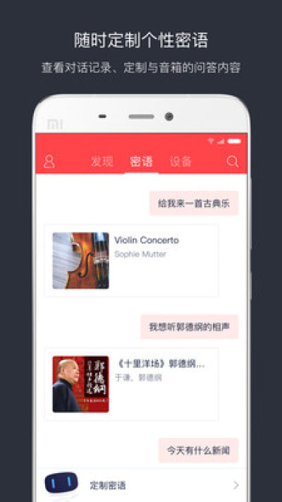 3、小度密语:你可以定制自己和小度音箱之间的问答内容,让小度成为你的专属生活小助手。你还能随时查看与音箱的对话记录,一切尽在掌握。