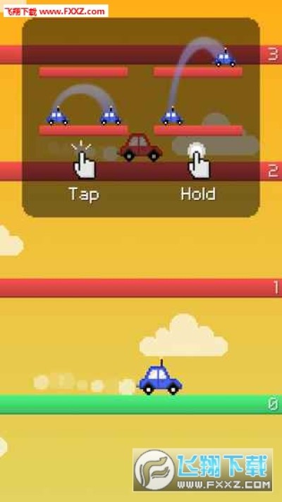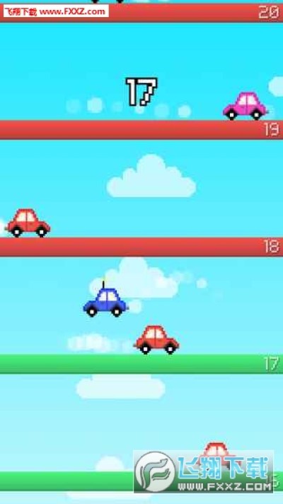 当玩家长按屏幕会使汽车跃起跳到上一层,另外玩家控制的汽车也不是停止的,也会不停地左右移动,这无疑加剧了游戏的难度。如何避开来回穿梭的车辆快速穿过道路,游戏适合单手操作,但是如果操作不好,就会成为一款虐心的游戏了。游戏的整个界面否非常的简洁好看,玩法就是要控制你的小汽车不断的向上跳跃,触摸不动则为连续跳跃,用于一层一层的往上爬。跳跃要注意时机哦,否则可能会撞车哟!