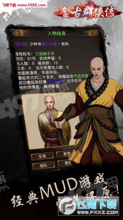 可以玩的武侠小说,你可以扮演侠客、杀手、富翁、美人、魔头。万人在线、自由PK!