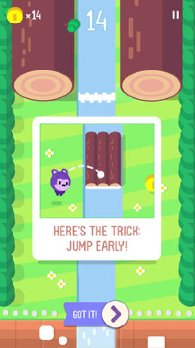 一款轻松休闲的跳跃游戏,玩家需要在游戏中控制小动物在一条小河中来回跳跃,小河虽然不大,但是动物们在跳跃时还是得借助河上浮动的木头。万一没踩中木头,可是会淹死在河里的!