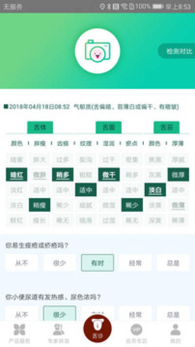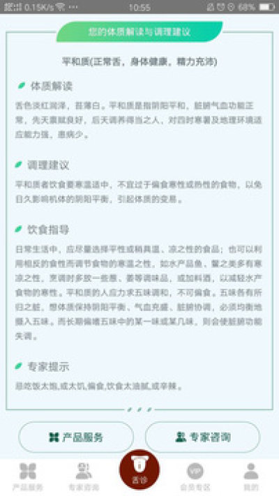 问卷调查得出先天体质,拍照自测得出短期体质,该怎么调理?别担心,体质解读、调理建议、饮食指导、专家提示,搭配合理的调理产品,帮助您恢复到最佳体质。