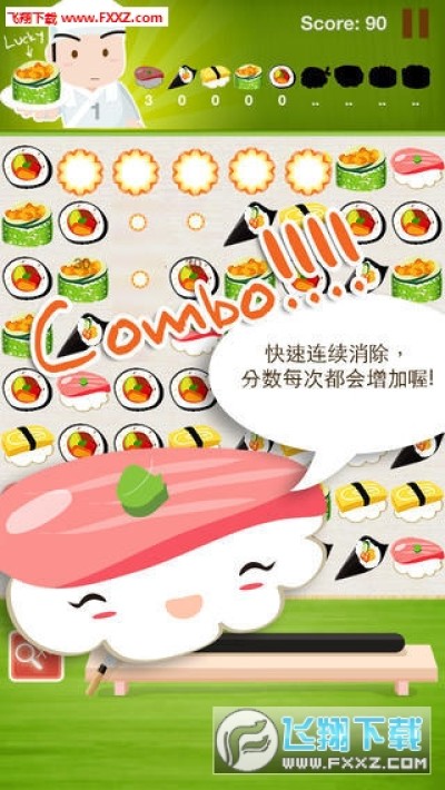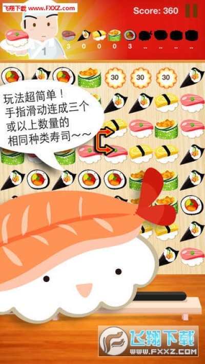 移动寿司的位置,将三个或三个以上的寿司放在一条线上就能消除,三个以上的寿司还可形成爆炸特效哦。