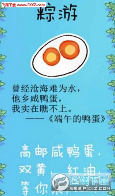 粽游这款手游是以即将到来的端午节为主题开发的功能性游戏,这里提供粽游手游官网下载,游戏中有各种被粽叶包裹的小可爱,游戏通过一些列小游戏来唤醒人们对端午的记忆。