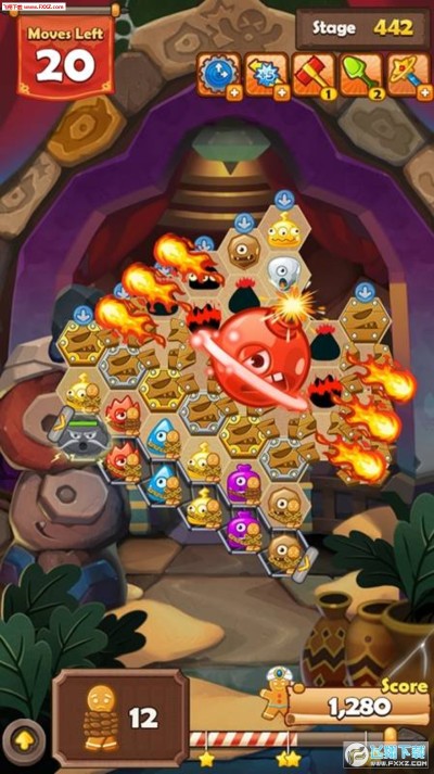 2、匹配三个或三个以上相同颜色的怪物,打败他们并保存姜饼朋友在六边形组成的董事会;