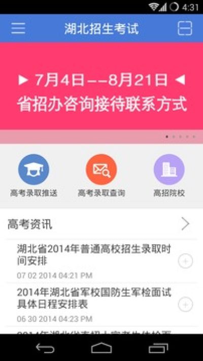 湖北招生考试为湖北省高考考生量身定做,整合了高招院校信息查询、高招院校答疑、高考分数推送、高招录取状态推送、高考政策资讯发布以及高考招生答疑等功能。