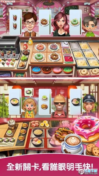 在餐馆业打拼并不容易.要提前准备美食,随时随刻开启奶昔机,天妇罗和薯条机.按照顾客的喜好搭配好汉堡和三明治裡的蔬菜和芝士,在拉麵上放上叉烧和鸡蛋,此外还要小心炉上的烤肉不能烤焦哦!随着订单的增加,忙的团团转的妳能体会到真实的餐馆生涯了吧!要高度集中注意力,这个游戏好玩的停不下来!
