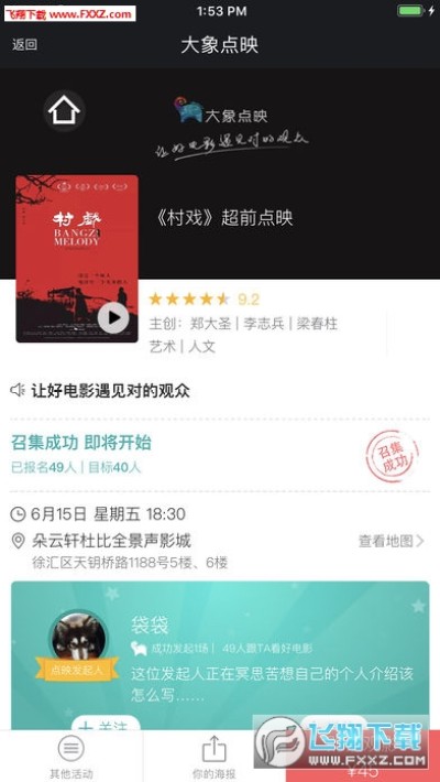 大象点映是全国首个在影院点播电影的观影社交平台,致力于让好电影遇见对的观众,用精准点映助力艺术电影、纪录电影宣发,探索互联网发行新模式,让每周都是电影节!