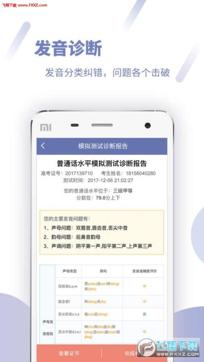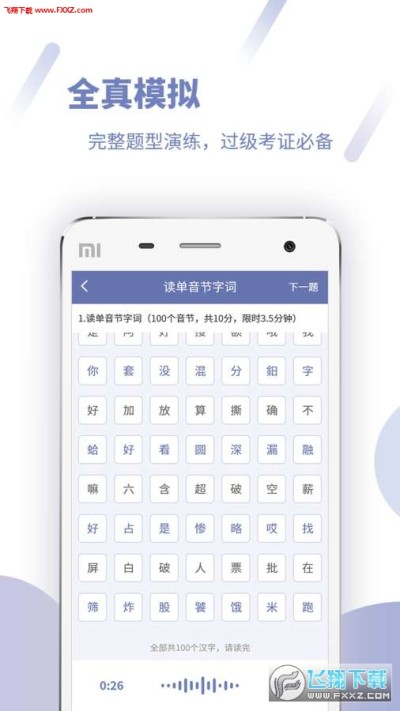 依据国家《普通话水平测试实施纲要》进行普通话模拟测试,与国家普通话水平智能测试流程高度一致,单音节字词、多音节字词、短文朗读、命题说话,面面俱到,让您在全真模拟测试环境中逐步提高普通话水平,轻松过级。