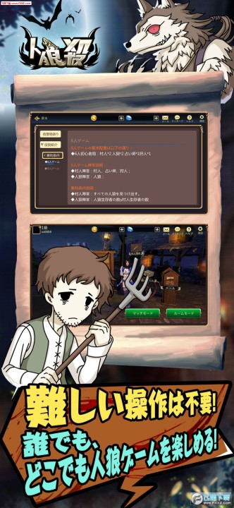 日本狼人杀是款3d的狼人杀游戏,在“Dostwodder”沿线莱茵河边的一个偏远地方有一个小村庄。村民每天都过着和平而没有冲突的生活。但不幸的是,有一天突然间,这个村庄遭到了诅咒,一些村民成了狼群。他们白天伪装成村民,晚上变成狼群,杀死村民。因为这是威胁生命的事情,请迅速查明谁是狼!