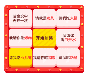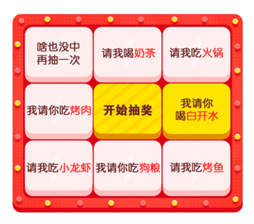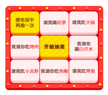 九宫格抽奖套路表情包来啦,这又是一款套路表情包,和众多抽奖表情包一样超级有趣哦,这一次有啥也没中再抽一次、请我吃烤鱼、请我吃小龙虾、请我吃火锅、请我喝奶茶、我请你喝白开水、我请你吃狗粮、我请你吃烤肉,不仅有你请我,还有我请你哦,喜欢的朋友赶紧来试试吧。