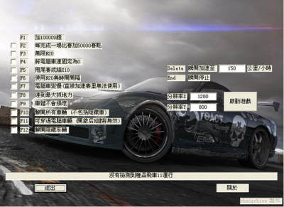 F2 开启后每场比赛后损坏奖励+5W点赛点,可以保证立即称霸并刷新赛道记录,再按F2即可关闭该功能