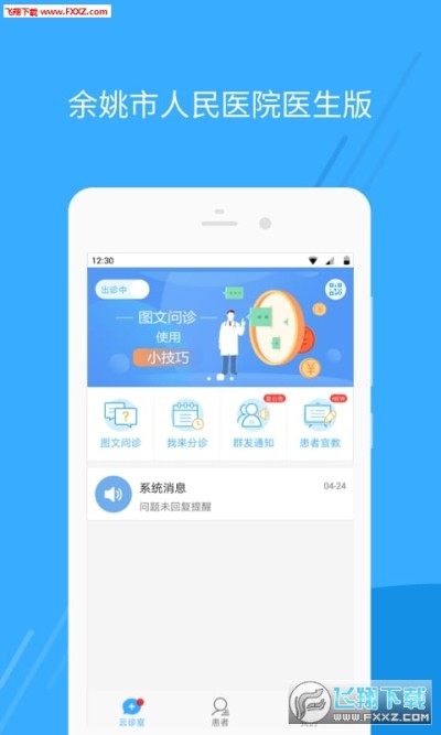 余姚市人民医院医生版软件是一款针对给余姚市人民医院医生使用的手机app,这款软件可以为用户提供在线看诊、分诊等等功能,同时能在线以图文方式与患者互动,非常方便,需要的用户快来下载吧!