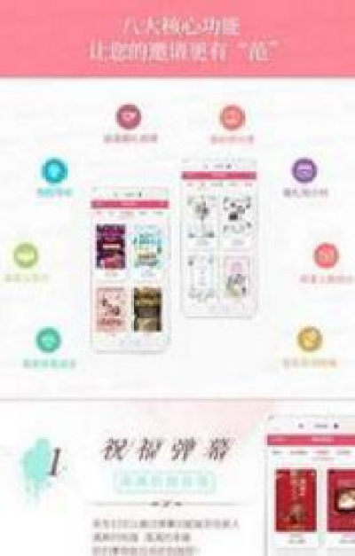 《婚礼倒计时》《浪漫婚礼视频》《婚纱相片分享》《自定义音乐》《宾客人数统计》《地图一键导航》《单独宾客姓名发送》《创意回门请帖》《送礼礼金功能》《弹幕祝福》《新人点赞》
