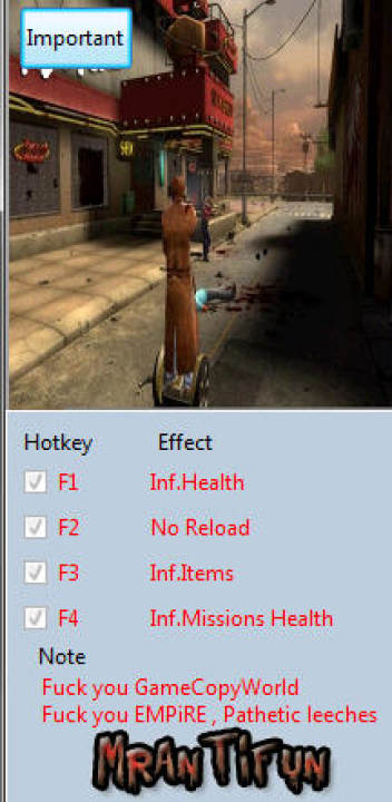 在《喋血街头3》中生命和子弹物品是相当宝贵的,最近有大神做出了四项修改器,可以让你拥有无限生命、无限物品。大家不妨试试。
