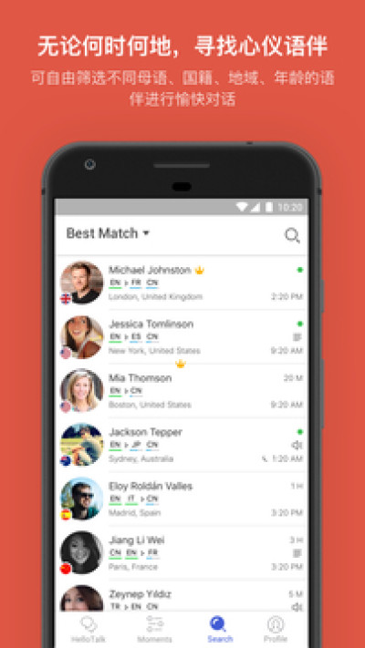 注册后,HelloTalk将根据你的母语和学习语言为你推荐和你学习需求相配对的用户。同时,你也可以按照自己的需求,根据母语、学习语言、语言等级,年龄、地域等选出理想语伴,即刻与他们无障碍沟通!