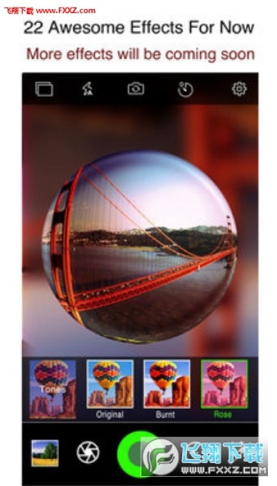 应用的界面是 iOS 7 扁平风格,并且是拍摄、编辑都在一屏中,不用拍摄完后进入编辑界面,直接是即时效果。应用支持中文语言,不过小编这里没有切换系统语言所以显示的是英文,大家知道就好。所有的功能按钮都排列在界面的上方和下方,上方包括相册导入图片、闪光灯开启、镜头翻转、定时拍照和应用设置。