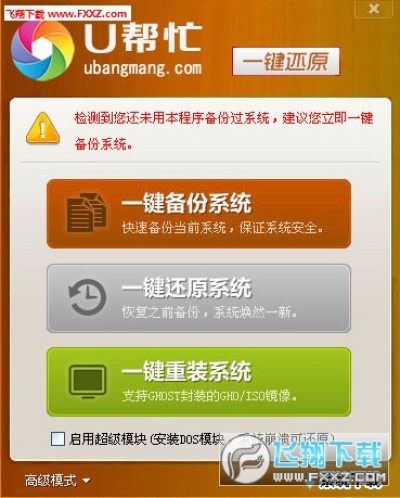 U帮忙一键备份还原系统:不用安装即可使用,绿色安全,兼容性强,功能完善。可在Win32(64)、WinPE、DOS 下对任意分区进行一键备份与还原,支持ISO文件、光盘、U盘里的GHO文件硬盘安装;支持设定密码保护、自定义热键等功能。