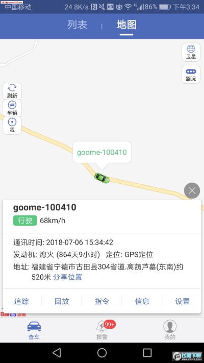 2.轨迹回放:支持回放180天内行车轨迹,回放过程中可显示车辆当时的车速、方向、停留时间等。