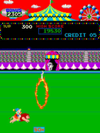 骑狮跳圈:小丑查理站在狮子的背上,指示狮子左右行进或跳跃,以跳过火圈或火炉,街机版者必须全程走完100米,到达终点,该关才算完成。火圈有三种:一种是单大火圈,也就是狮子比较能轻易跳过的;另一种是单小火圈,狮子要靠技巧与时机才能跳过,但该火圈会有钱袋可供玩家加分;第三种是双大火圈,比单大火圈的困难度稍高一点。无论是火圈或是火炉,只要查理或狮子碰触到火,均算失败,并损失一条生命。
