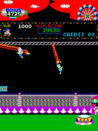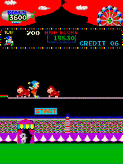 马戏团(别名:小丑查理)是我们80后在FC上最爱的游戏之一,怀旧的同学如今可以在PC上利用MAME模拟器重温一番。游戏中的小丑可以表演6个项目,基本上都是以跳跃为主,分别是:骑狮跳圈、走索跳猿、蹦床跳跃、平衡踩球、马上跳跃、空中飞人。