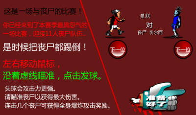 丧尸罚球是一款把足球和僵尸结合到一块的FLASH小游戏,游戏操作简单,但是非常需要技巧,而且比较有挑战性。虽然是简单的鼠标点击踢球,但是小编已经可以爆球和连击了,最多一次一个球可以连击四次,而且小编发现,足球直接爆僵尸头是最有效的方法。