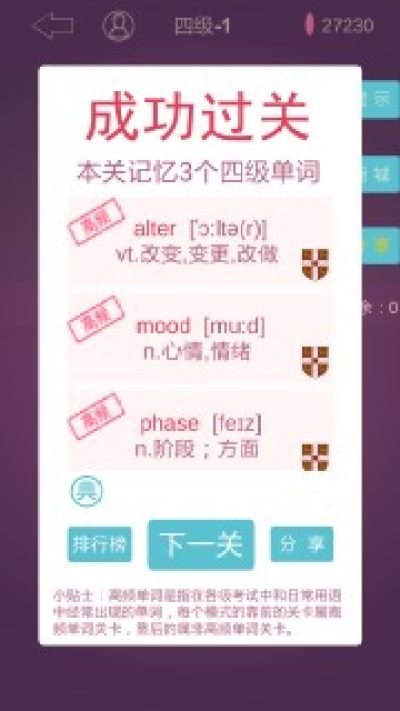英语消消乐是一款帮助用户记忆英语单词的应用。用户一边过关得分,一边巩固已掌握的单词和学习新的单词,可以显著提高记忆的词汇量。