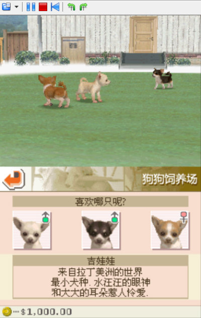 《任天狗:吉娃娃和伙伴》是史上最成功的宠物养成游戏之一,被《FAMI通》评为满分作品。游戏中你不仅可以通过触摸来抚摩小狗与它们玩耍,还能通过麦克风录下它们的名字及动作指令来呼唤它们,投入感满点。