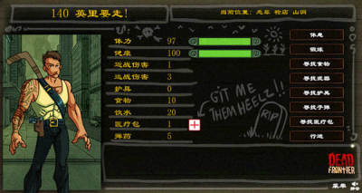 水够6的时候就锻炼,平时牺牲健康来恢复体力。医药包比水还好找。有药包,食物有50就开始一走往前走,一路上随机有各种事件可以有水和食物,还有医药包。都够用。锻炼的时候会增加近战攻击,路上的丧尸基本三刀一个。