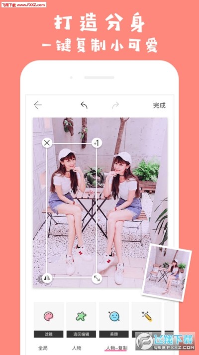 马卡龙玩图能够智能识别出人、背景、车、小鸟、猫、狗等多种元素,用户可以对单个物体进行独立编辑,不仅可以对独立的人物进行美颜、滤镜、风格渲染以及替换背景,还可对独立的人物做“模糊”、“复制”、“放大缩小”与“对称”等操作 。