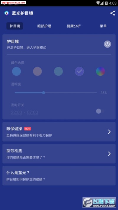 蓝光护目镜手机版可以在系统亮度的基础上再降低屏幕亮度,让用户在夜晚关灯的情况下保护眼睛避免高背光伤眼