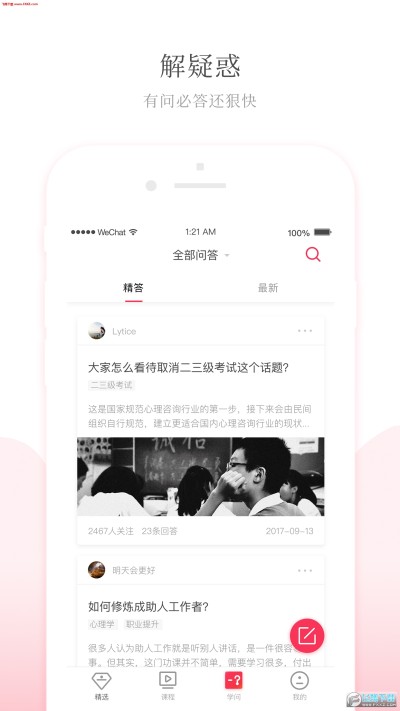 天天心理网倾力打造的一款移动心理学教育APP。 学员在这里可以聆听国内外知名心理学名家讲师的精品课程, 同时我们有着专业的后期制作团队,带给您高质量的课程体验。这款移动心理学教育app让您不受地域的限制,随时随地想看就看,下载离线观看更是合理利用了您的碎片化时间, 制定学习计划让学习有的放矢。