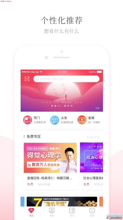 [其他功能]:心理学文章丰富您的精神世界;学习记录、收藏、我的课程等功能让您的学习之旅更加恣意舒畅