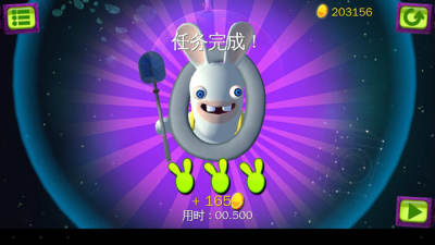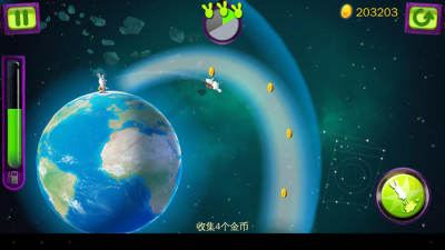 “疯狂兔子”这个角色原本是《雷曼》系列中的配角,但是凭借宇宙第一呆的蠢样子,宇宙第一贱的尖叫声,以及宇宙第一恶心人的生活习惯(用马桶刷刷牙),人气一路飙升。游戏开始时会有两只傻兔站在某星球的顶端,一只手持棒球棍,另外一只则是背着小型飞行器,玩家按住屏幕选定方向之后松手,拿着棒球棍的兔子就会毫不客气的对着旁边的小伙伴的屁股狠狠来上一发,被打飞的兔子可以利用喷气背包飞的更远,收集金币。点击暂停按钮可以让地图缩小,方便玩家确定方向。