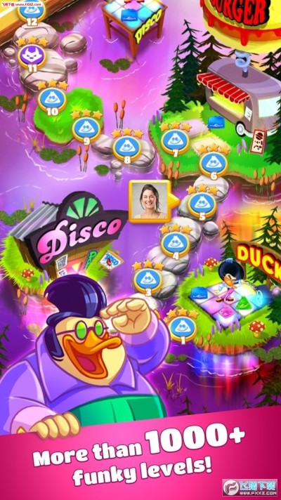 《迪斯科鸭子》是一款Q萌可爱画风的休闲益智类游戏,经典的三消玩法元素,卡通的可爱鸭子形象,游戏中玩家将三个或三个以上相同颜色的鸭子组合在一起即可消除它们,完成每一关卡的消除任务,即可收集更多星星,还有道具可以帮助过关,可爱的迪斯科鸭子等你来体验!
