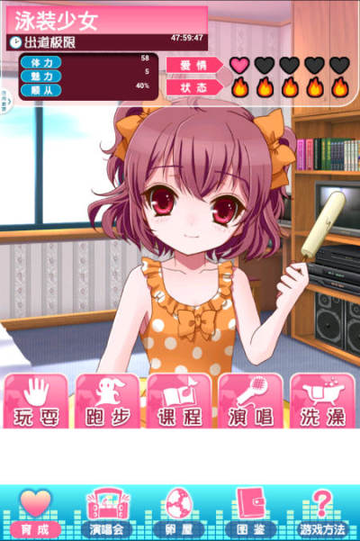 2、然后进行育成,对萌妹子进行玩耍,跑步,课程,演唱,洗澡等操作,会让她的魅力、体力、顺从大大提升,随着魅力的提升她的状态会越来越不好,直到状态耗尽,就不能对她进行相应的操作了。