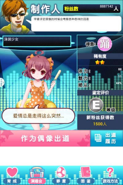 3、培育的差不多,想要对她进行出道,选择演唱会,就可以顺利的出道了,这时会对你进行相应的评分,拥有一定的分数数量。同时你还可以看到她的出道履历。