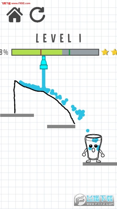 快乐玻璃画线(Happy Glass Draw)游戏安卓版是一款趣味性十足的益智休闲游戏。游戏画面中有一个空杯子与一个水龙头,水龙头会放出水出来,玩家需要画一条线条,让水龙头的水可以自然流入空杯子中,根据流入空杯子的水量,来得出玩家赢得获得关卡星数,有机会获得一颗星,甚至三颗星。